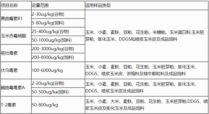 | 伏馬毒素 | 100-6000ug/kg | 玉米、小麥、麥麩、豆粕、花生粕、玉米胚芽粕、膨化玉米、DDGS、噴漿玉米皮、濃縮料及犢牛顆粒料及成品飼料 |