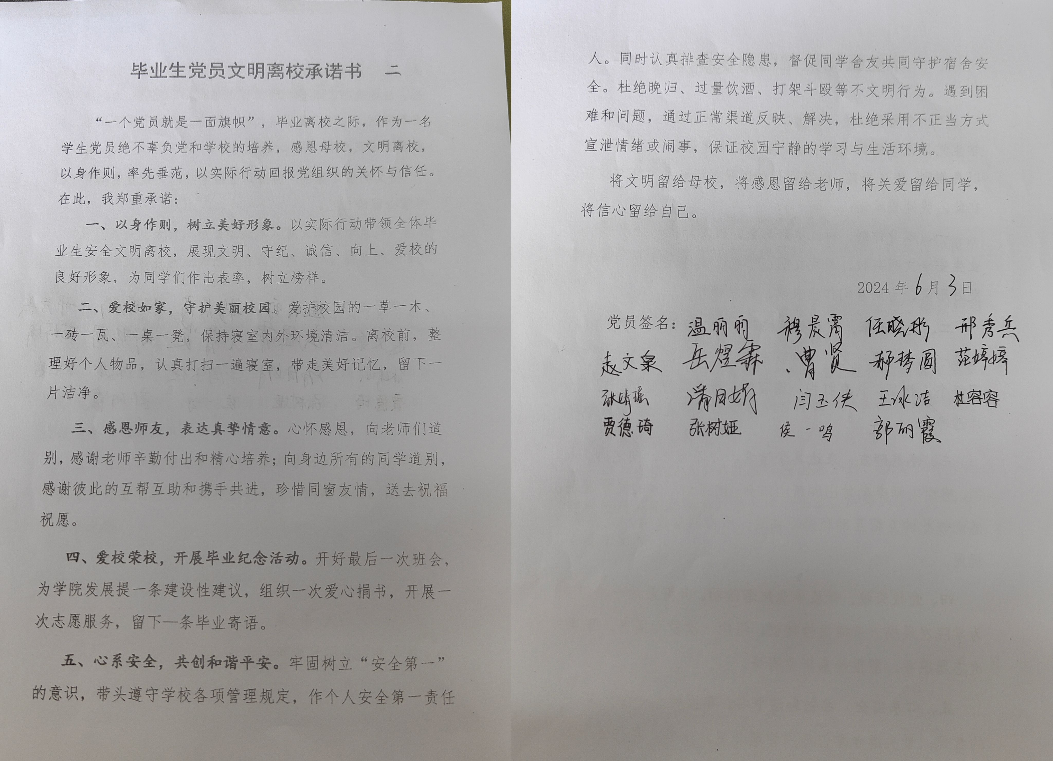 注重开展仪式教育,引导毕业生党员珍视政治身份。毕业之际,学院认真开展文明离校教育,组织学生党员签署《文明离校承诺书》,增强学生党员的自律意识,让学生党员做好模范带头作用,引领毕业生安全、文明离校。学院与未就业党员签订《党员就业争先承诺书》引导党员强化就业责任,转换就业观念,离校前力争落实就业去向,在就业上走在前做表率。