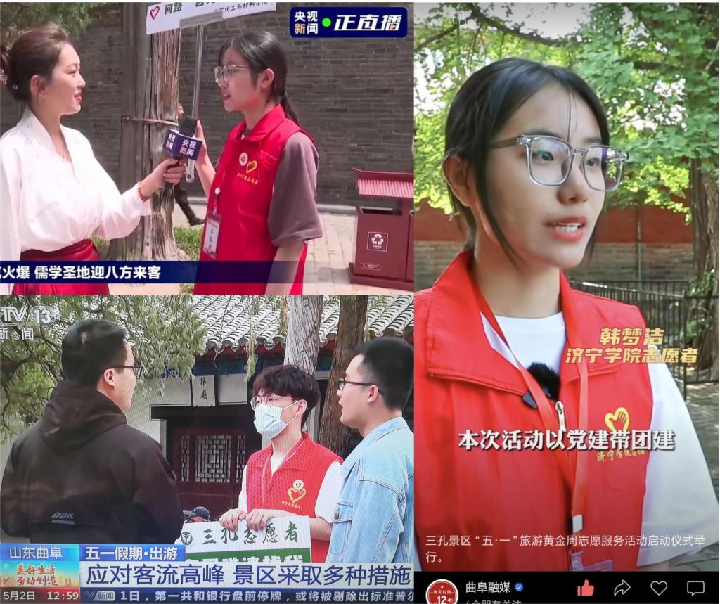 在志愿服务的过程中,志愿者们积极解答游客咨询的各种问题,主动为游客提供帮助,劝阻游客的不文明行为,热情疏导景区人流,用友善的言语、热情的举动,展现圣地学子的儒雅之风,展示好客山东的曲阜风采,获得了各地游客的一致好评,央视记者和曲阜市融媒体中心对志愿者活动进行了采访和报道。