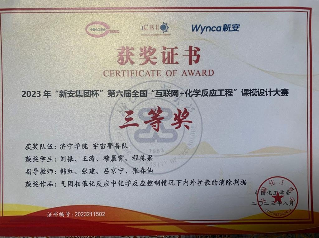 2023年8月,由中国化工学会主办、浙江工业大学承办的“新安集团杯”第六届全国“互联网+化学反应工程”大学生课模设计大赛落下帷幕,我院“宇宙警备队”团队获得三等奖的优异成绩。这是我校自2021年参加该项赛事以来,连续第三年获得全国三等奖。