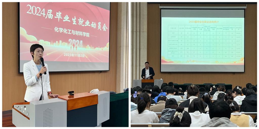 党委副书记王明锋为分析了学院近两年毕业生的就业去向以及当前化学化工行业就业形势和影响因素。鼓励毕业生们要抓住秋招有利时机,利用好校内外各种资源,积极参加学校、学院组织的各类型招聘活动,要做好充分的就业准备。