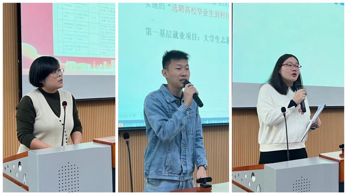 国际教育学院丁文霞对出国留学项目进行介绍,辅导员李天乐对基层项目及征兵入伍政策进行解读,丰雪情就本学期的就业安排、毕业生就业手续办理流程以及就业信息获取渠道等内容进行说明。