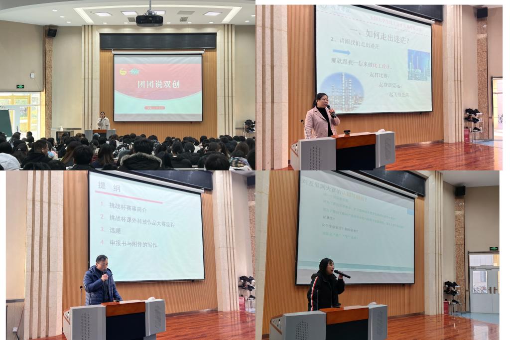 李文婷为同学们解读了创业就业普惠政策,以及大学生创新创业和学科竞赛相关知识,带领大家学习了《伟德victor1946创新创业与学科竞赛指引目录》和bevictor伟德国际1946大学生创新创业类教育全年系列活动安排,并展示学院2023年大学生创新创业和学科竞赛成果,让同学们对创新创业政策和各类竞赛有了更深入的了解。李继森从“挑战杯”竞赛简介、挑战杯课外科技作品大赛流程、选题、申报书与附件的写作几个方面对同学们做了详细指导,并提出大学期间要积极参与科学研究和论文发表的建议,对同学们日后的就业、升学具有很大帮助。张春仙老师从大学目标定位、全国大学生化工设计竞赛介绍、备赛收获等方面入手,鼓励同学们积极参加科学研究和学科竞赛,在竞赛中提升创新意识和创新能力,并给同学们播放了历届获奖学生寄语视频,同学们积极响应,纷纷加入交流群。杨慧芝为同学们分享了“互联网+”大学生创新创业大赛的开展时间、模式和要求,讲解了参与竞赛的重要意义和所需条件,勉励同学们积极参加创新创业竞赛,为学业深造、未来职业发展打下坚实基础。