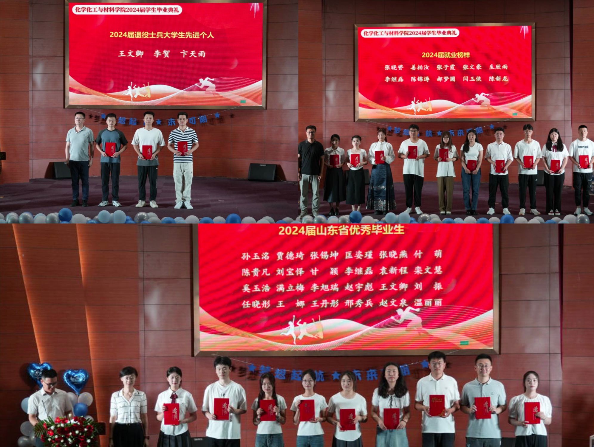 在热烈的氛围中,毕业班班主任为各班毕业生代表颁发毕业证书;副院长袁宽瑜、郑逸群为“2024届就业榜样”、“2024届退役士兵大学生先进个人”颁发荣誉证书,党委书记马新蕾为24名“2024届山东省优秀毕业生”颁发荣誉证书。