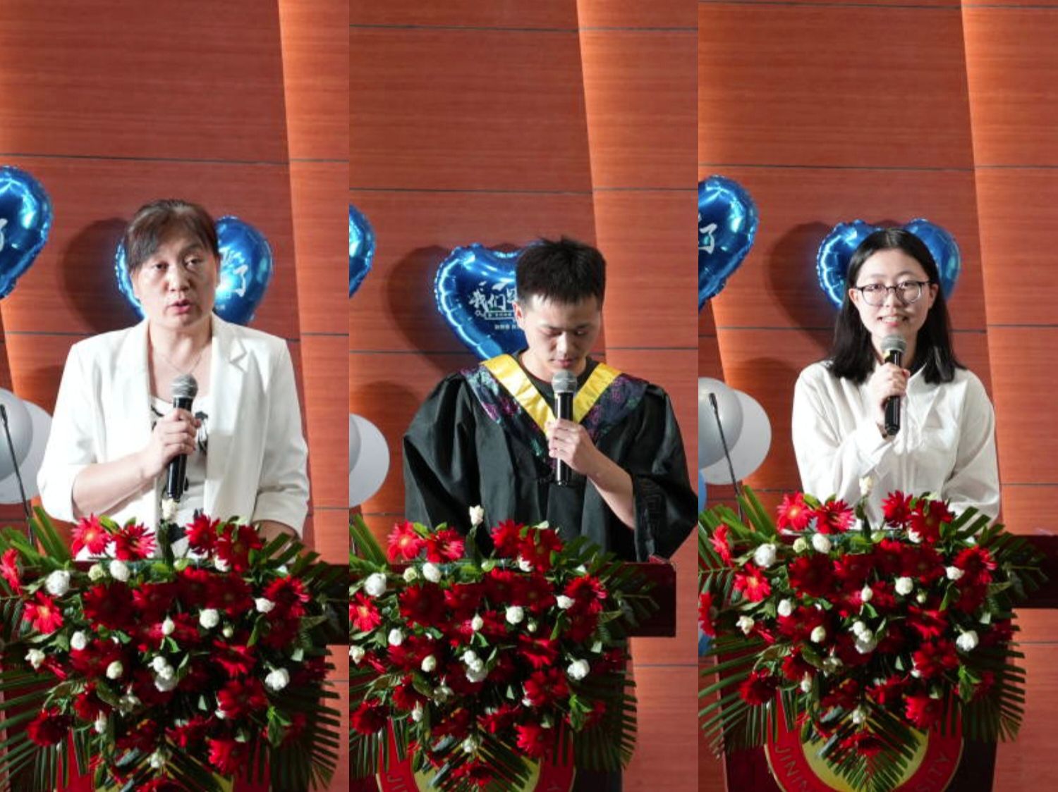 教师代表郑晓雯为毕业生送上真挚祝福,表达了作为班主任老师的骄傲自豪和对同学们即将离别的不舍之情。毕业生代表王文卿发言回顾大学时光,表示师恩如山,将在感恩中砥砺前行,不畏艰难,将勇敢面对未来的挑战。在校生代表褚芮瑶向即将踏上新征程的学长学姐表达祝贺和感谢,表示将以优秀毕业生为榜样,接力前行,以优异成绩报答师恩。