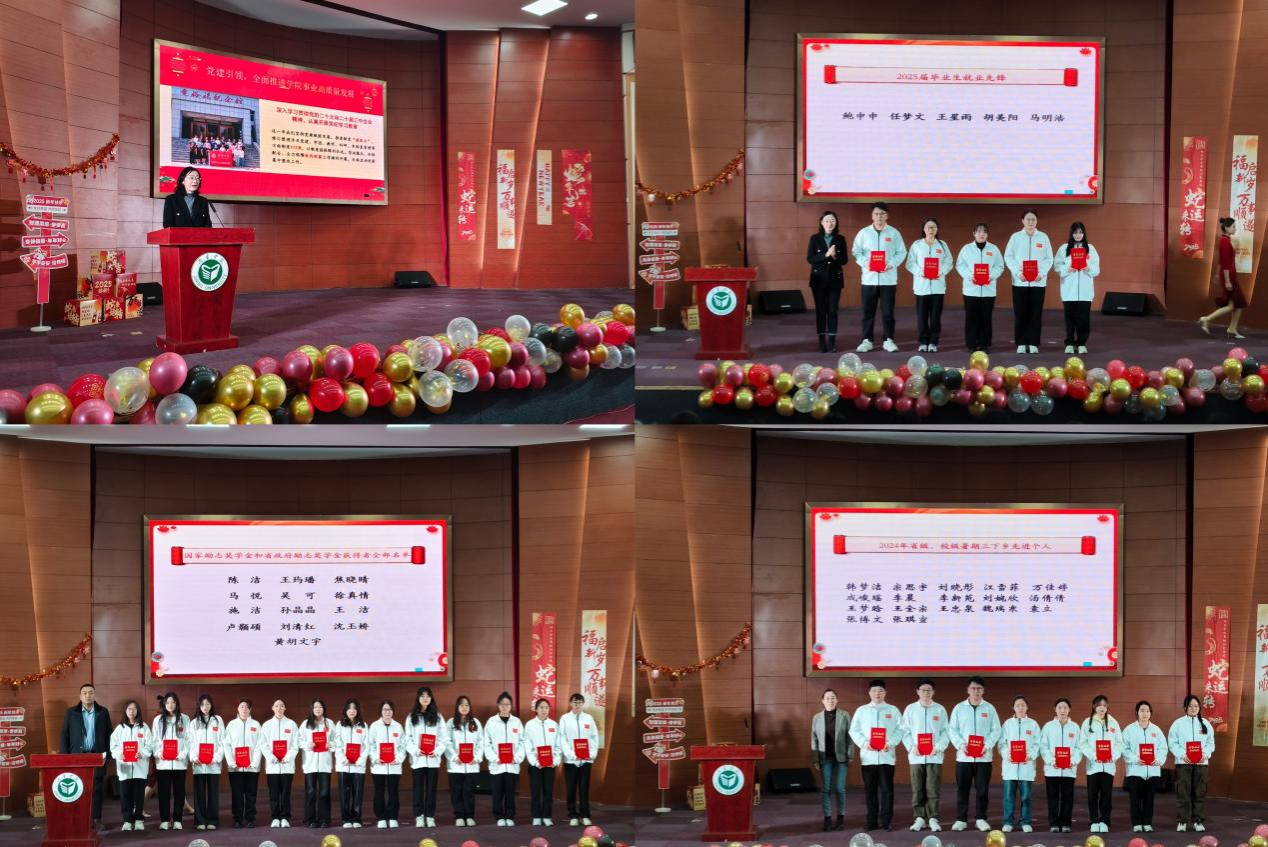 观看视频《我们的2024》之后,马新蕾致新年贺词。她回顾了过去一年学院取得的成绩,表达了对全院师生、校友的衷心祝福,展望2025祝愿学院发展再谱新篇,祝愿祖国繁荣昌盛。随后,现场领导老师为2024年国家励志和省政府励志奖学金获得者、2024年暑期三下乡先进个人和2025届毕业生就业先锋颁奖,激励同学们在新的一年中继续锐意进取、奋发拼搏。活动开启了新一年学风建设工作,强调进一步加强学风建设是学院2025年重点工作之一,将以本科教育教学审核评估为契机,强化“学生中心”,构建全员全程全力促进学风建设的工作体系。