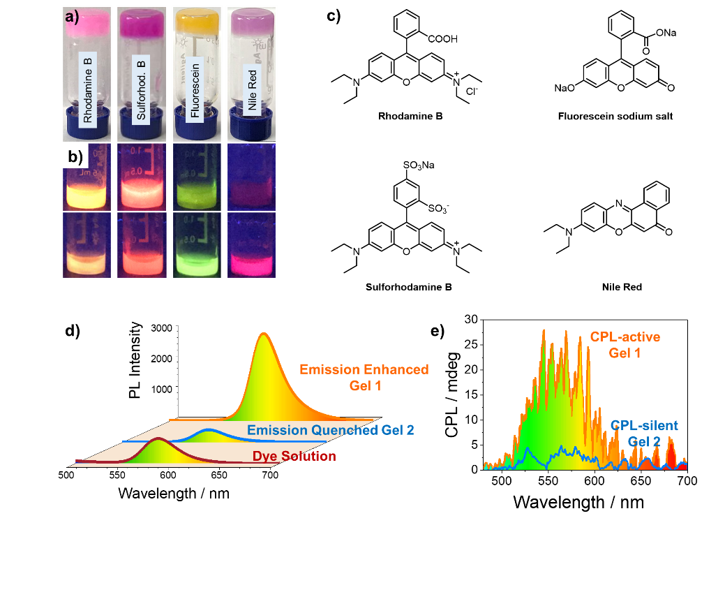图2:(a, b)以Gel 1为基质的复合水凝胶外观及其与染料溶液的荧光强度对比;(c)采用的荧光染料分子结构;(d)Rhodamine B染料的溶液及其与Gel 1和Gel 2复合水凝胶的荧光光谱对比;(e)Rhodamine B与Gel 1和Gel 2复合水凝胶的CPL光谱