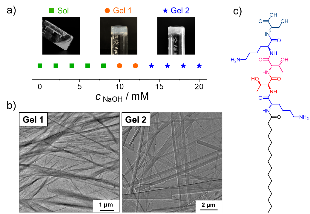 图1:棕榈酰五胜肽的分子结构、水体系相图及两种凝胶的微观形貌(TEM)
