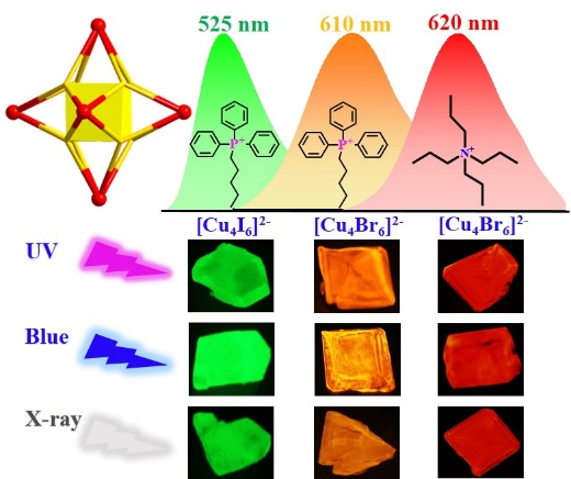 为了解决三维铅基钙钛矿纳米晶在性能以及环境污染问题上的短板,雷晓武、宫仲亮老师以高效、稳定、无毒、发光效率高的亚铜卤化物纳米团簇作为无机骨架,设计合成了三种具有优异X-射线闪烁发光性能的新型发光材料。首先,通过蒸发饱和结晶的方式,采用卤化亚铜与有机盐反应制备了高质量的[PTPP]2Cu4I6、[PTPP]2Cu4Br6和[TPA]2Cu4Br6晶体。这些晶体都通透,在紫外光的激发下显示出绿色、橘色、红色的荧光,PLQY分别达到了93.1%,80.21%和71.10%。其次,通过对晶体变温荧光光谱的表征分析,得知其结合能Ea分别为为43.4 meV、38.66 meV和35.86 meV,这有利于产生高效荧光,黄昆因子S值分别为65、57和48,声子能量分别为21.72 meV、17.32meV和15.27meV,确认了该材料内存在着较强的电声子耦合作用。另外,这些卤化物表现出优秀的闪烁性能。该材料的光产额大于商用LYSO: Ce,检测限为0.7563 μGyairs-1,低于商用值5.5 μGyairs-1,采用该材料做X射线成像,发现其长时间暴露在X射线下依旧稳定,空间分辨率达到0.187 μm,分辨率达到14.83 lp mm-1该工作为设计合成环保型杂化金属卤化物X射线闪烁体提供了新的合成思路。