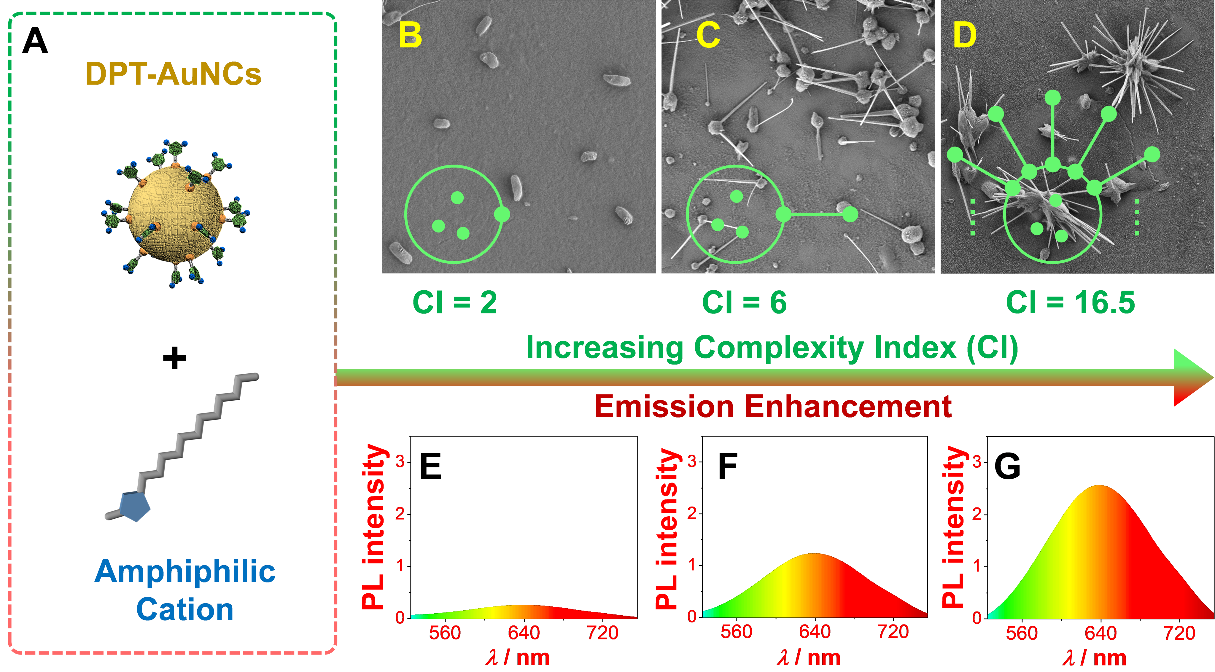 金纳米簇是一种具有核壳结构的有机-无机杂化纳米颗粒,其表面配体可以为自组装提供多种非共价相互作用,是模拟自然界复杂自组装结构的理想构筑单元。bevictor伟德国际1946张勇杰课题组和曲阜师范大学沈静林课题组以一种4,6-二氨基-2-嘧啶硫醇修饰的金纳米簇(DPT-AuNCs)为构筑单元,通过与两亲性阳离子(十二烷基咪唑鎓,DMI+)共组装,实现了对聚集体结构复杂度的调控,并制备出具有“海胆状”结构的强发光聚集体。为了定量分析聚集体复杂度与荧光强度之间的关系,作者基于图论模型计算了不同聚集体结构的复杂度指数(CI),并得出:聚集体的荧光强度与其复杂度成正相关关系。