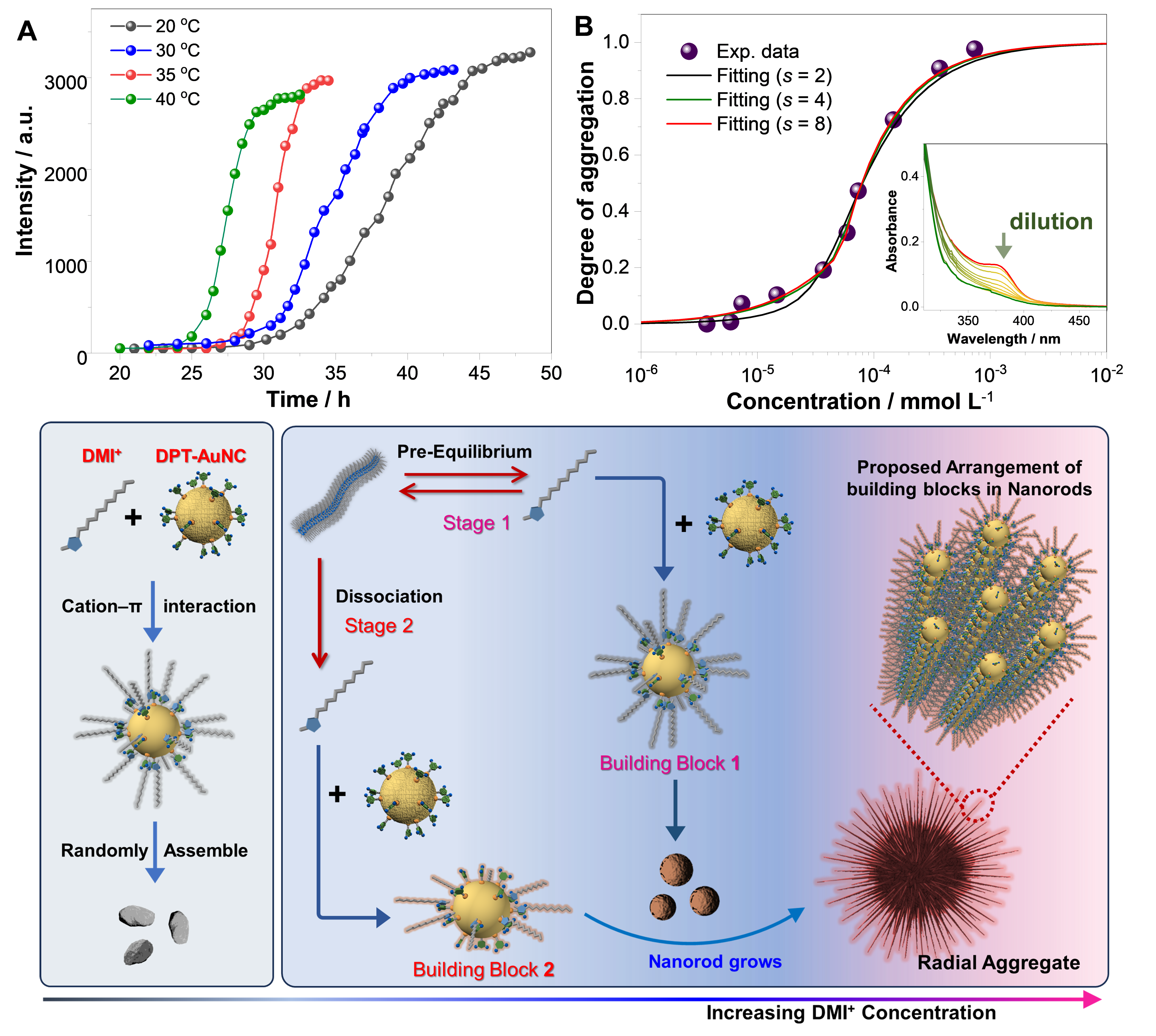 作者进一步研究了“海胆状”聚集体的组装动力学与热力学机理。通过荧光光谱强度监测了不同温度下聚集体的生长动力学,发现动力学曲线存在明显的迟滞时间,表明其组装过程为成核-生长机制。又通过变浓度UV-Vis吸收光谱研究了组装过程的热力学机制,利用Goldstein-Stryer模型的拟合,验证了“海胆状”聚集体的形成是由多种非共价相互作用主导的协同自组装过程。此外,随着温度的升高,动力学曲线的迟滞时间缩短,因此可以推测,在DMI+浓度高于其临界胶束浓度的情况下,DMI+首先自身形成胶束聚集体,而随着时间的推移,DMI+从胶束中解离并进一步和DPT-AuNCs共组装,缓慢生长成具有复杂结构的聚集体;体系温度的升高有利于DMI+胶束的解离,因此加速了复杂聚集体的成核,使迟滞时间缩短。