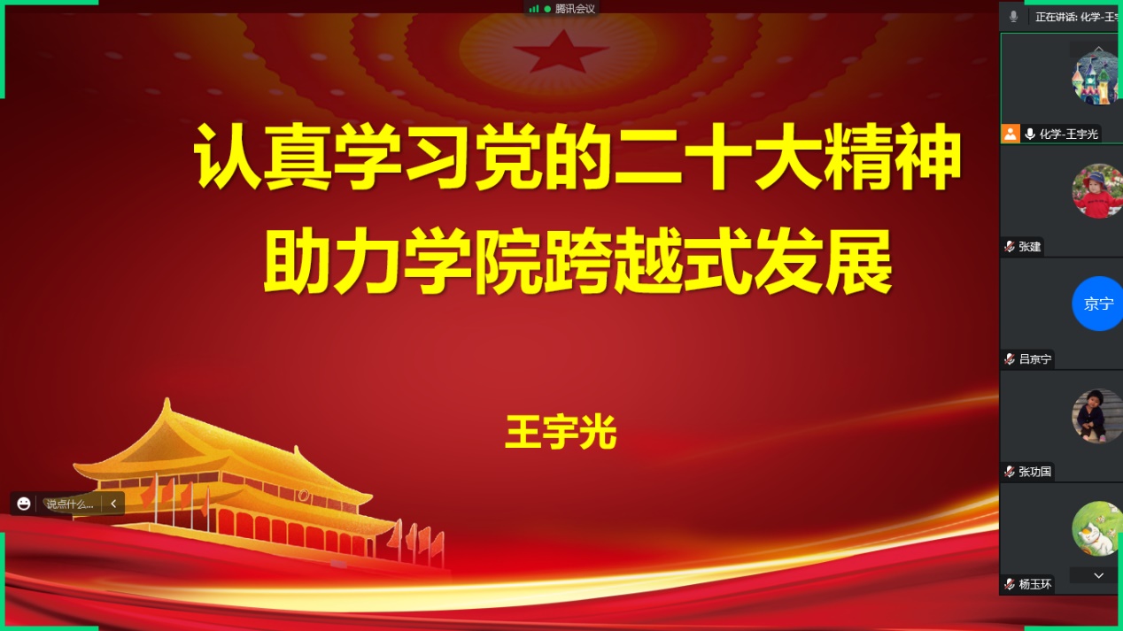 教工党支部书记王宇光做了《认真学习党的二十大精神,助力学院跨越式发展》报告。勉励大家作为教育工作者,我们要认真学习贯彻党的二十大精神,坚持用习近平新时代中国特色社会主义思想铸魂育人,不忘立德树人初心,坚守教育报国理想,把全部精力和满腔真情献给党的教育事业,努力成为业务精湛、学生喜爱的高素质教师,为我院跨越式发展作出新的更大贡献,以实际行动落实党的二十大精神。