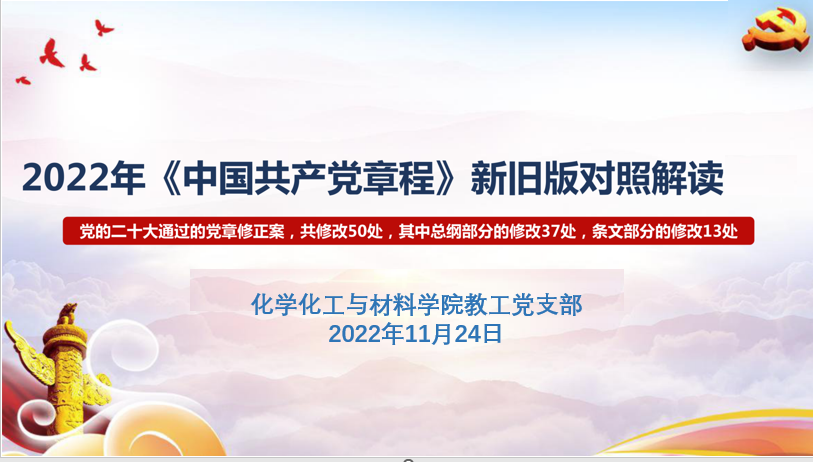 教工党支部委员吕京宁对2022年《中国共产党章程(修正案)》作了解读。2022年10月22日,中国共产党第二十次全国代表大会通过了《中国共产党章程(修正案)》,共修改50处,其中总纲部分的修改37处,条文部分的修改13处。每个修改之处吕京宁都进行了新旧版本的对比解读,让全体党员对党章学习更加深入。