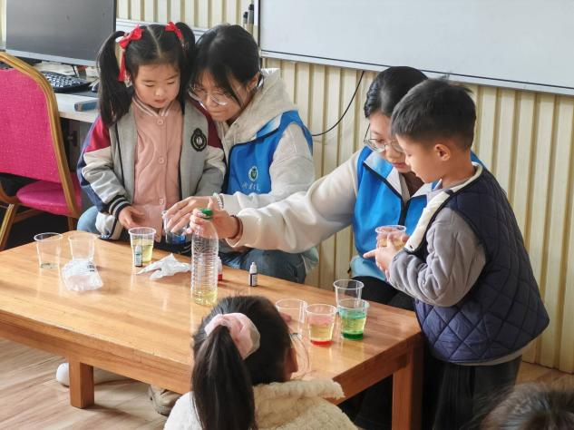 在蓼河湾幼儿园,志愿者为孩子们带来了丰富有趣的化学实验小课堂课程。实验使用小苏打、白醋、气球、矿泉水瓶、水、油、色素等生活中常见的物品作为实验材料,用通俗易懂的语言为小朋友们解释了实验背后的科学原理。小朋友们通过积极动手参与实验,并认真观察实验现象,深入了解了化学反应的原理和过程,让他们对所做的化学实验有了更加深刻的印象。