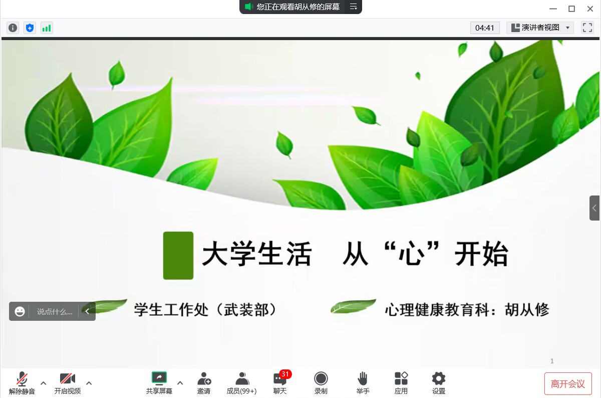 为缓解因疫情防控延期开学的大一新生负性情绪,保障疫情防控阶段新生的心理健康,提高学生的心理适应能力,伟德victor1946举办了大学生心理健康教育讲座,本次讲座以“大学生活,从‘心’开始”为主题,由辅导员胡从修主讲,22级全体新生参加。
