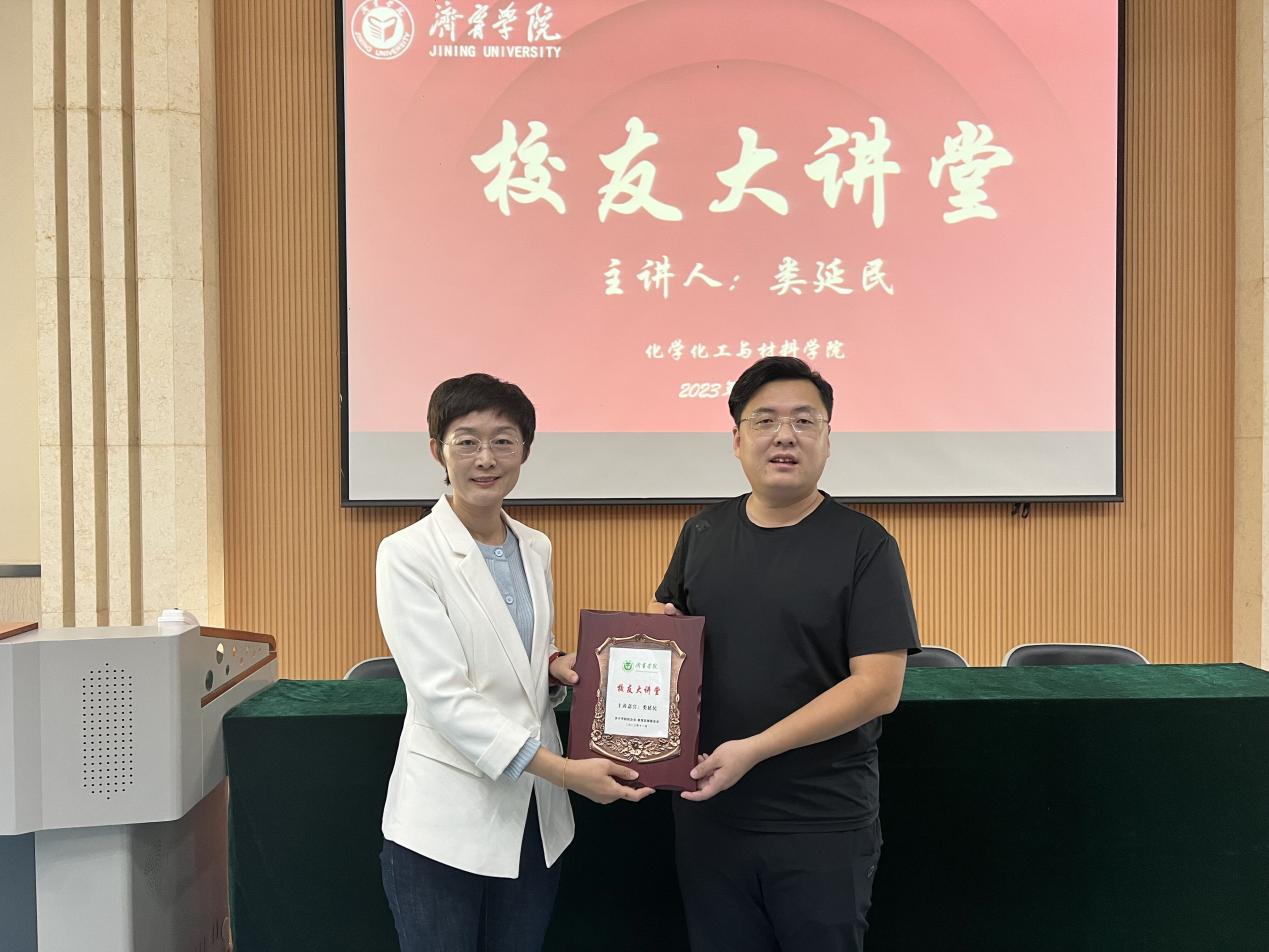马新蕾为校友类延民颁赠“校友大讲堂”纪念铭牌,并希望他能够积极发挥创业典型示范作用,为母校的发展做出新的贡献。